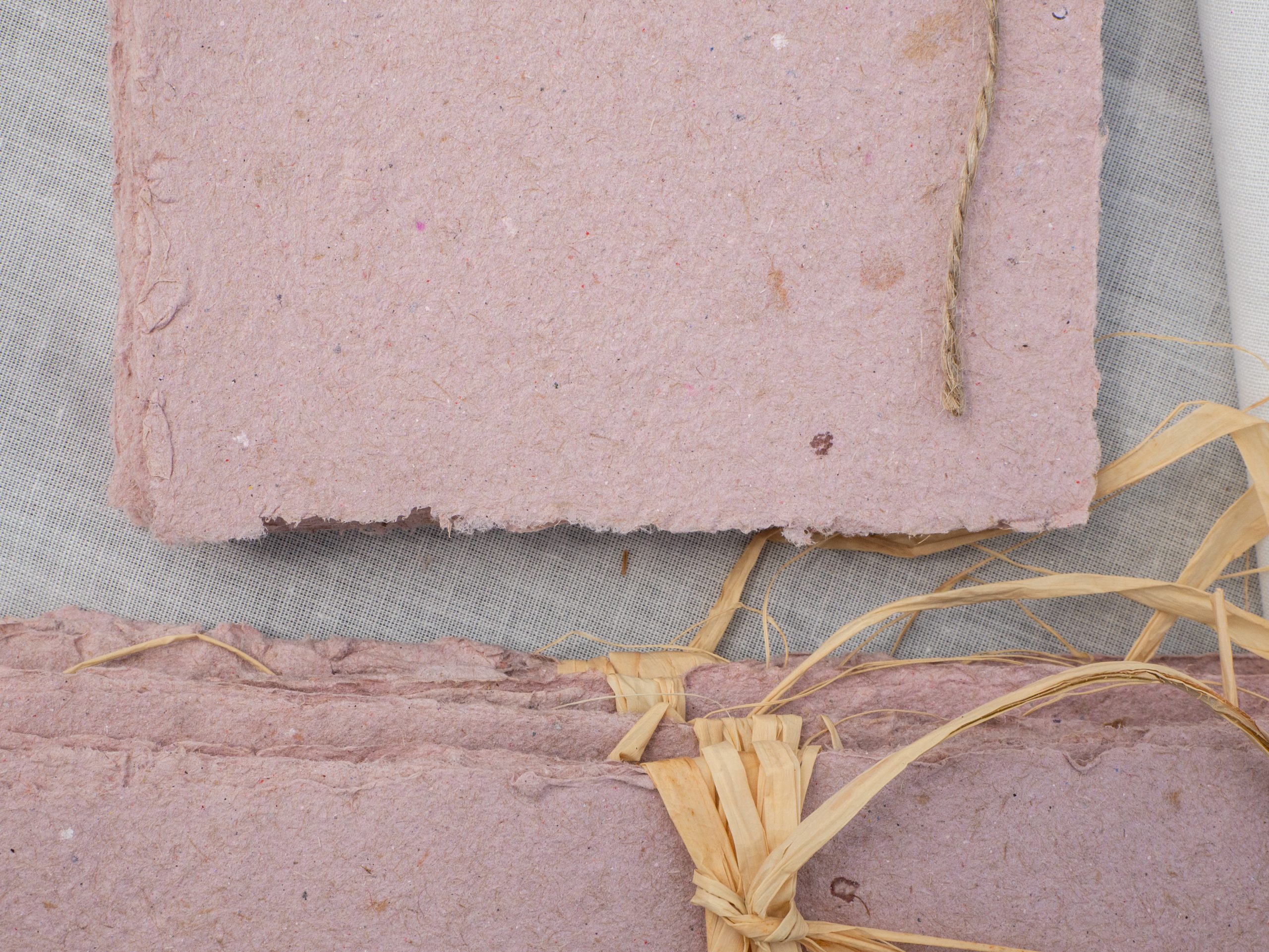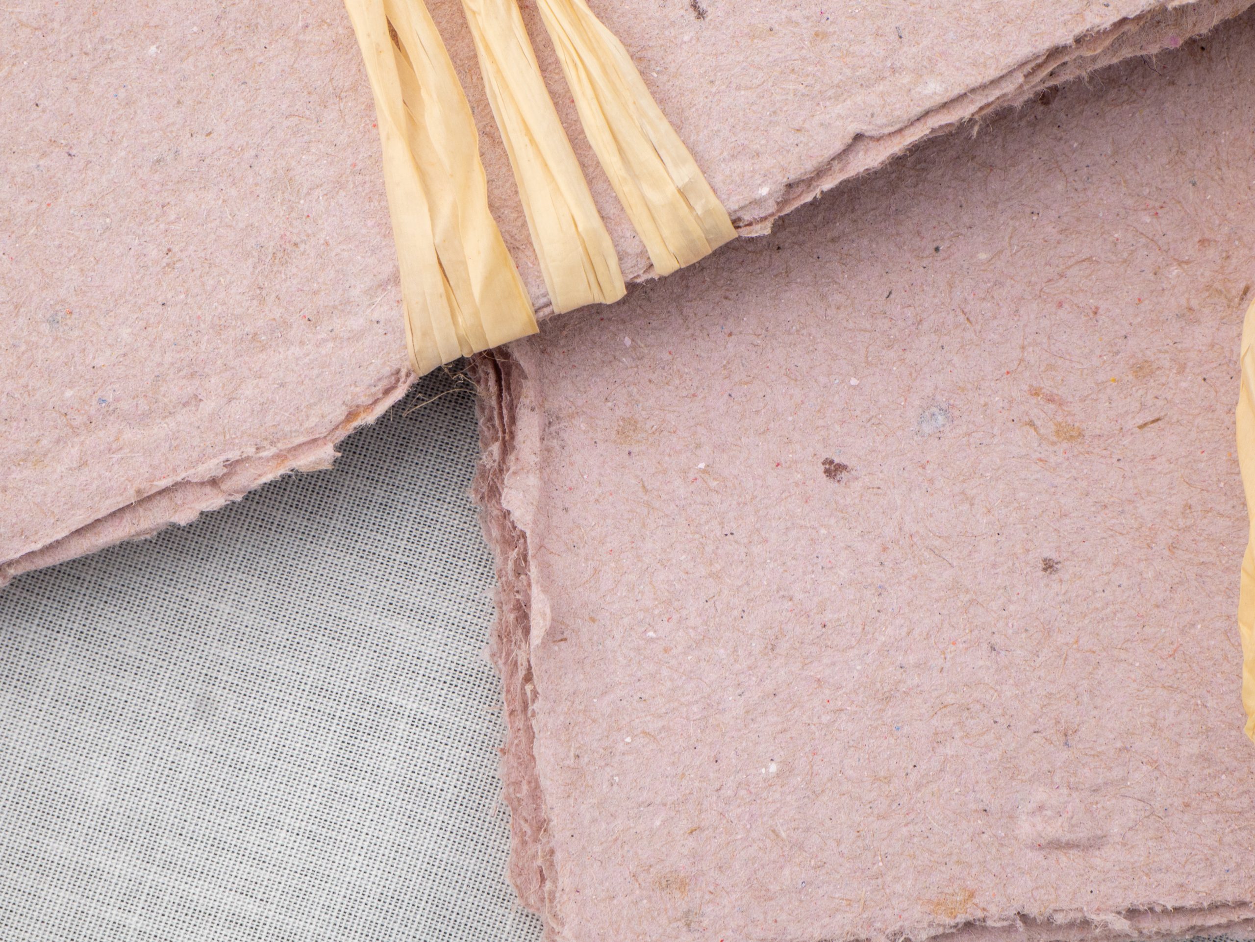 Papier recyclé artisanal, fabriqué à partir de chutes de papier et carton, soigneusement sélectionnés.